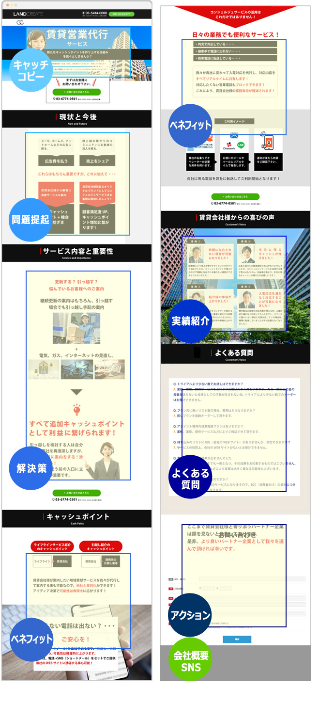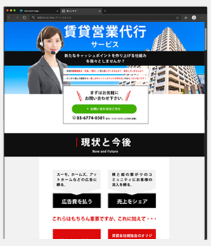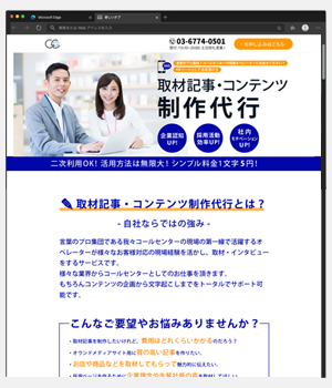 ランディングページ制作だけでなく、WEBマーケティング全般(広告集客、アクセス解析など)はもちろん、WEBマーケティング業界にとどまらず、通販サイト運用やバックヤード業務を請け負うコールセンターを運営しています。これらの実務までのインフラを提供できる総合的なサービスをワンストップで提供しています。